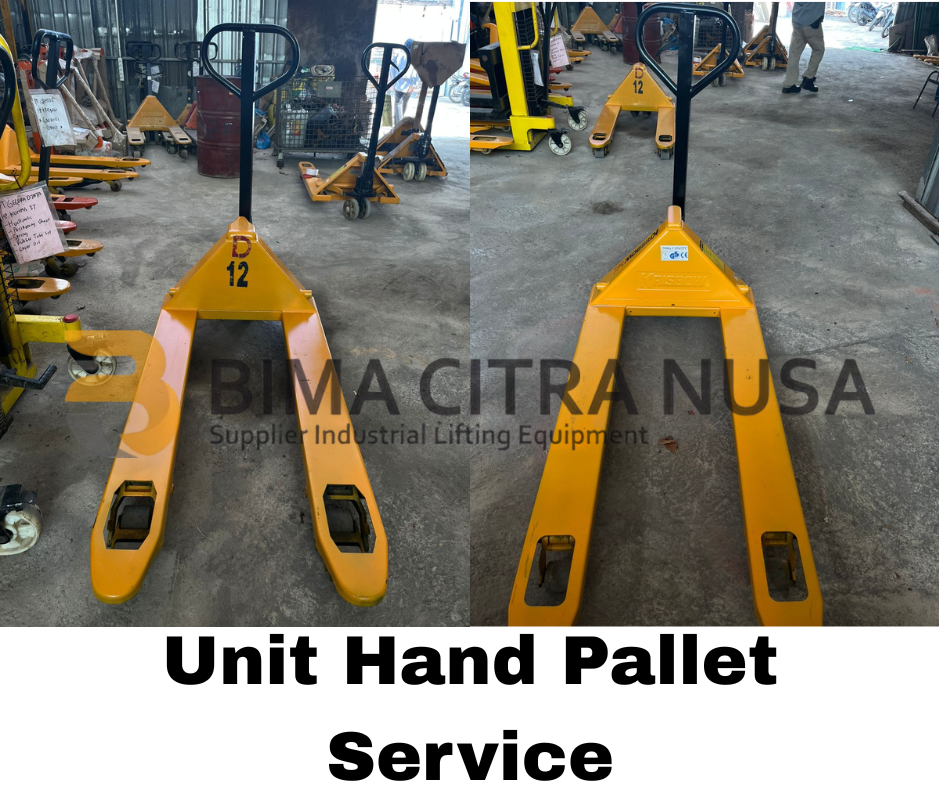 Kami BIMA CITRA NUSA menyediakan layanan jasa service hand pallet berkualitas dan bergaransi untuk berbagai merk, jenis dan kapasitas. Apapun jenis keluhan dan kerusakan didukung dengan teknisi kami yang ahli dan berpengalaman. Kemudian kami memastikan setiap perbaikan dilakukan secara profesional, cepat dan tentunya sesuai SOP Perusahaan. Mulai dari perbaikan pompa hidrolik, penggantian roda, hingga pengecekan menyeluruh, semua dikerjakan dengans tandar tinggi dan menggunakan sparepart terbaik dan berkualitas. Lalu kami juga memberikan garansi layanan sebagai bentuk komitmen terhadap kuliatas kerja kami seperti maintenance onsite jika terdapat komplain dari customer, sehingga pelanggan merasa aman dan puas. Layanan kami cocok untuk kebutuhan industri, gudang, dan logistik, Kami siap melayani Anda di wilayah Surabaya dan sekitarnya!